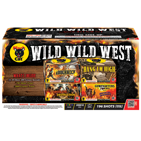 Four assorted 49 shot 500g Black Cat cakes, featuring two top sellers; Gunfighters From Hell and Absolute Destruction, Plus 2 new Black Cat Cakes - Roughneck and Hang Em High..